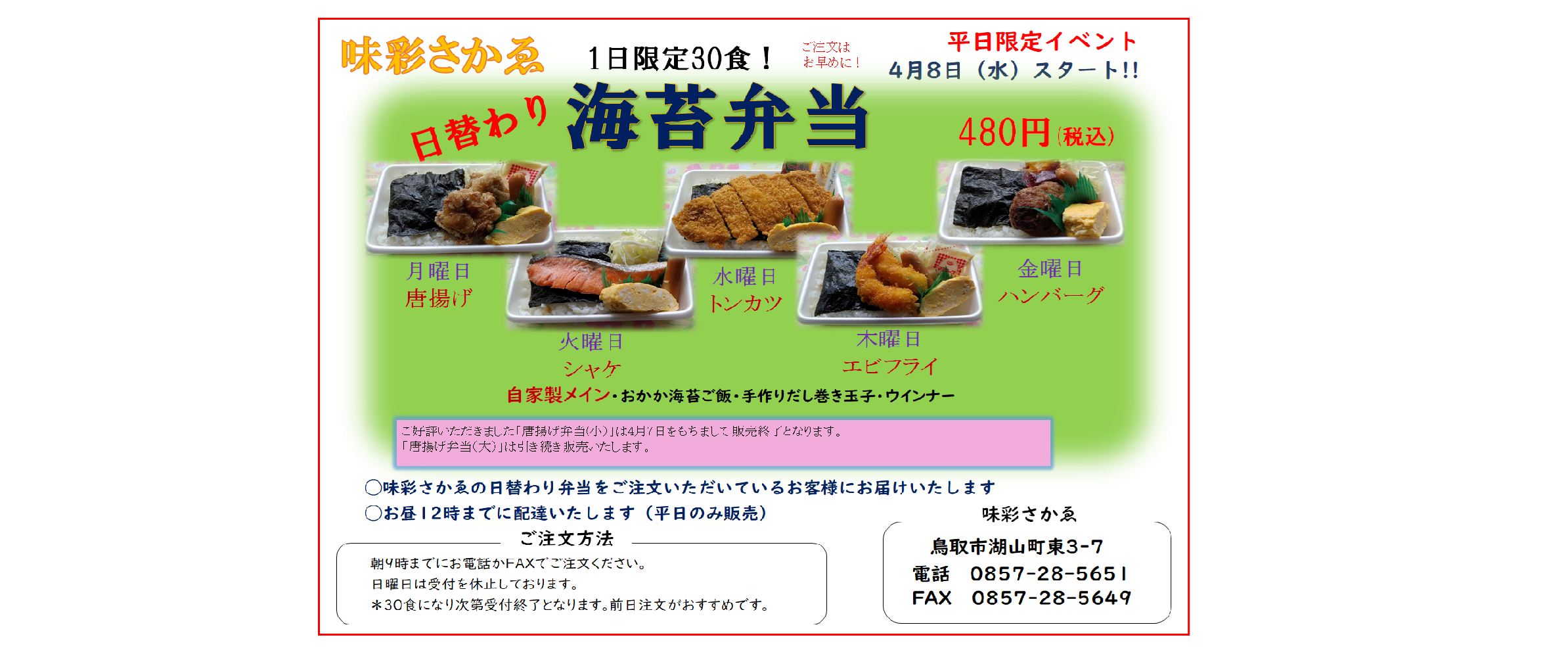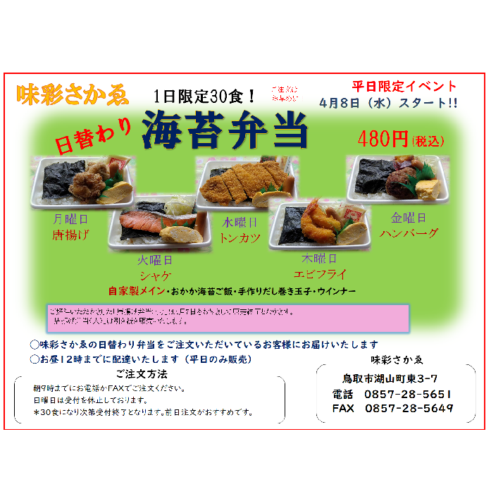 「味彩さかゑ」では、毎日のビジネスランチから、地産の素材を生かした仕出し料理までお客様に満足して頂けるお食事をお届けします。