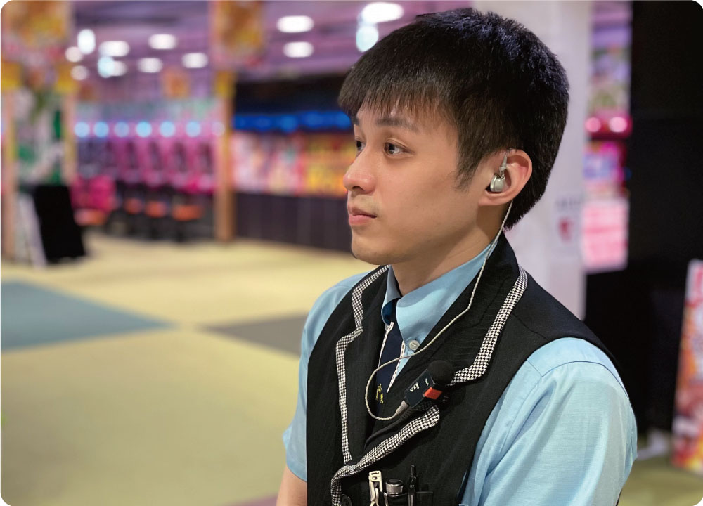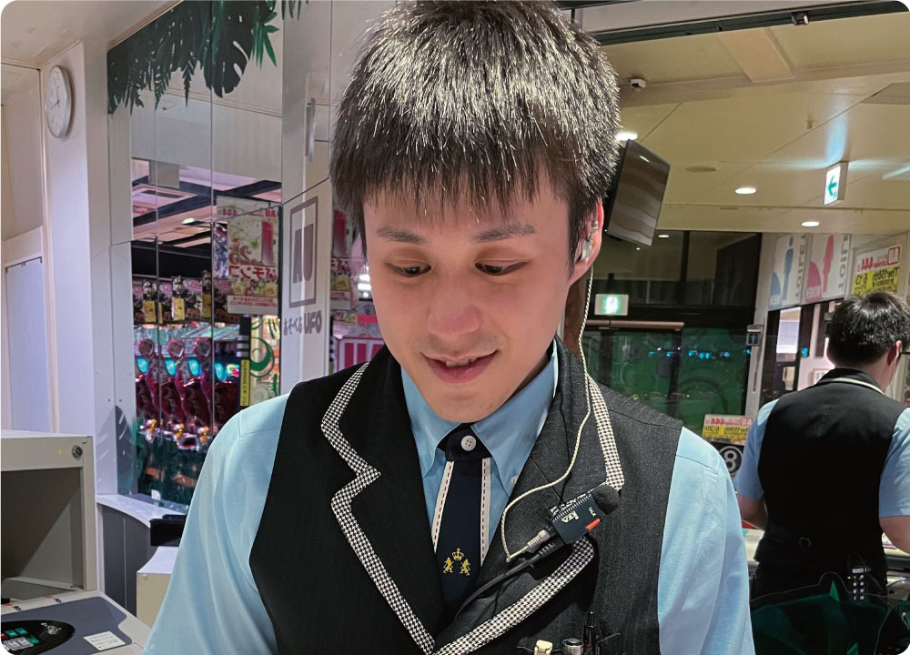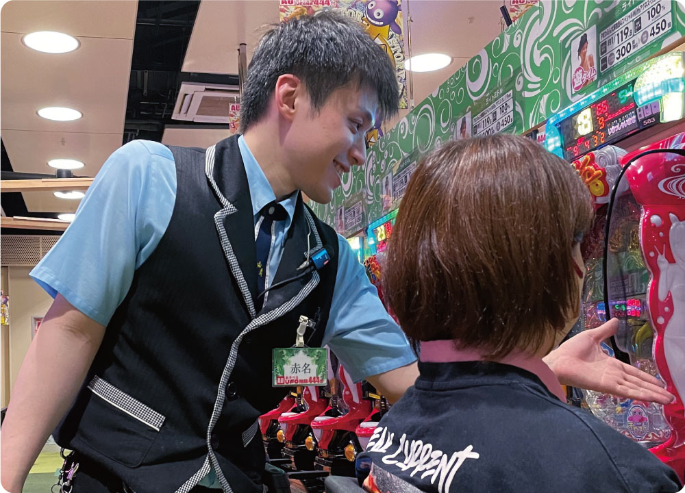 パチンコ台・フロアの清掃やお客様対応などを担当しています。パチンコ・スロットについて最初は何も知識がなかったため、わからないことばかりでとても不安でしたが、身近な先輩に優しく教えてもらいながら徐々に仕事を覚えていきました。